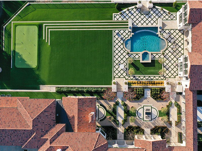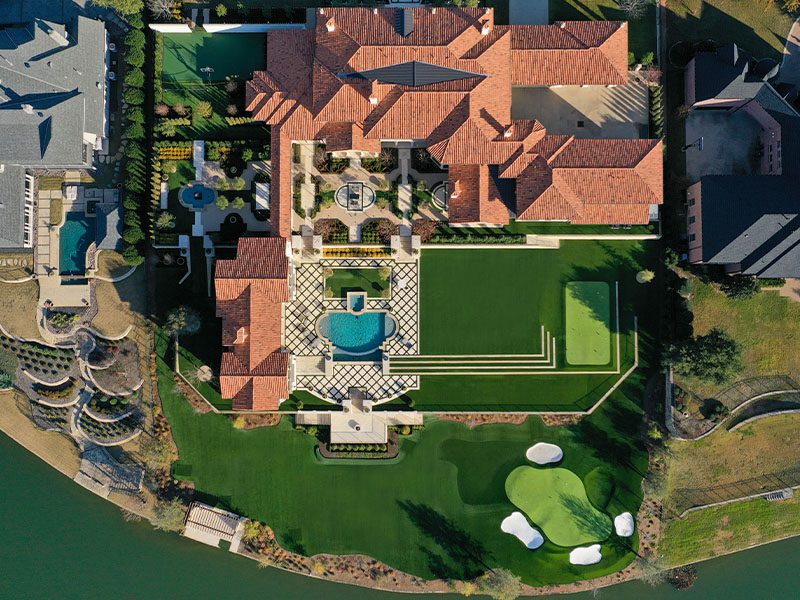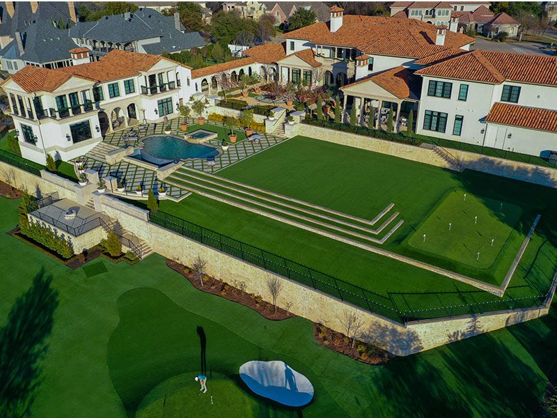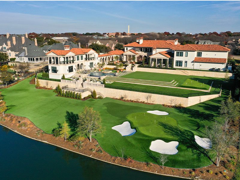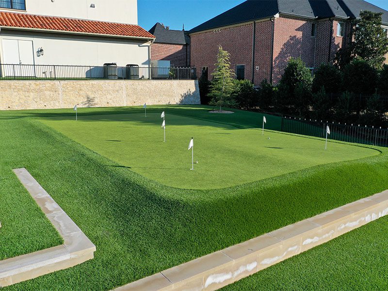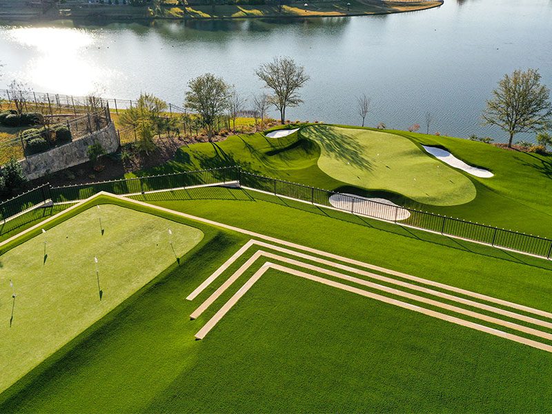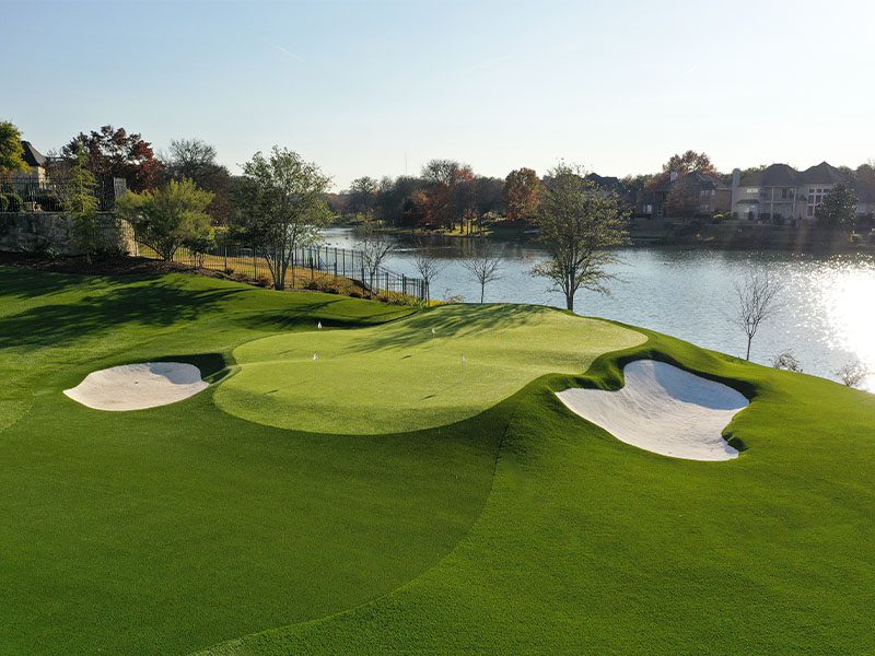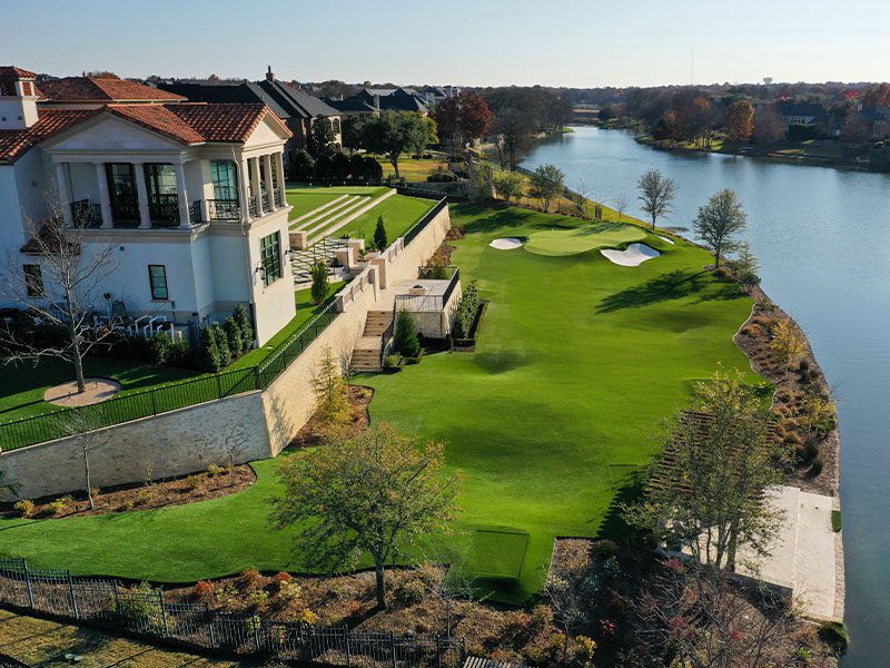 This client lives on the lake, and wanted their backyard to be as beautiful and fun as the lake is. We installed turf stripes in the pool area to create a deck around it, as well as stripes on the stair steps going down to the lake. There is a putting green installed in the upper level of the of the yard near the house, then another, larger, putting green with bunkers down by the lake. The putting green down by the lake has undulations and multiple chip boxes, giving the client multiple angles of practice.