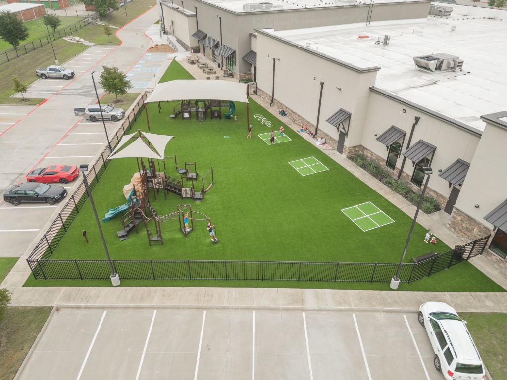 Aerial view of a custom-designed community recreational area featuring synthetic grass playground surface and marked four-square areas. This commercial artificial turf solution ensures a safe, low-maintenance, and vibrant outdoor space for community interaction, offering durable, evergreen surfacing beneath the play structures.