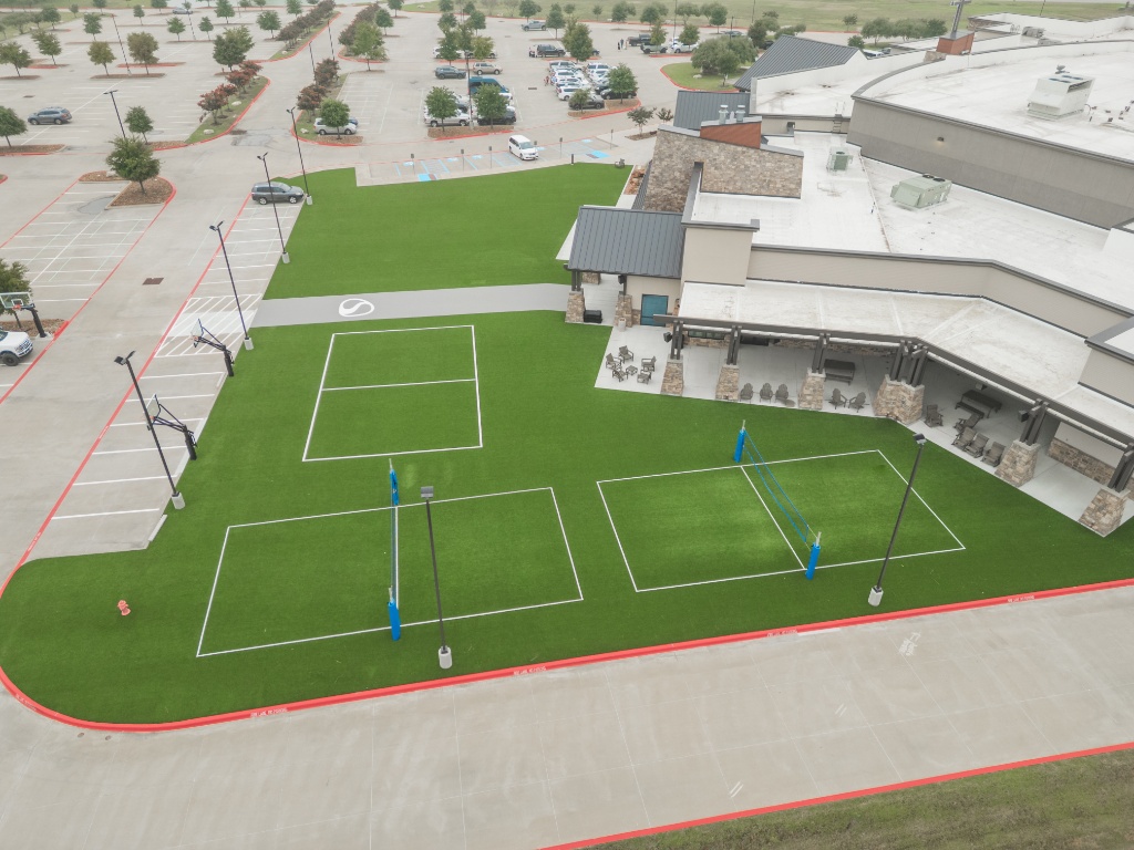Professional installation of custom synthetic turf volleyball courts and a multipurpose sports area for a community centre. This low-maintenance sports court design uses durable fake grass to withstand heavy use, featuring clear line markings and a custom logo turf path leading to the entrance, demonstrating high-quality commercial artificial turf solutions.