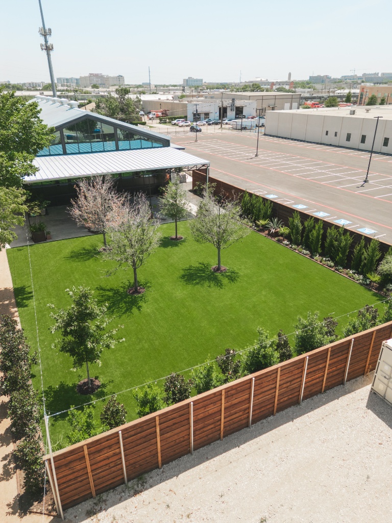 Aerial view of Cullen Yards, a premier Fort Worth event space, featuring a pristine fake grass installation to create a low-maintenance wedding venue entrance. Our commercial artificial turf, Trek Turf, provides a clean, elegant, and durable outdoor flooring solution that significantly enhances the venue's upscale commercial design.