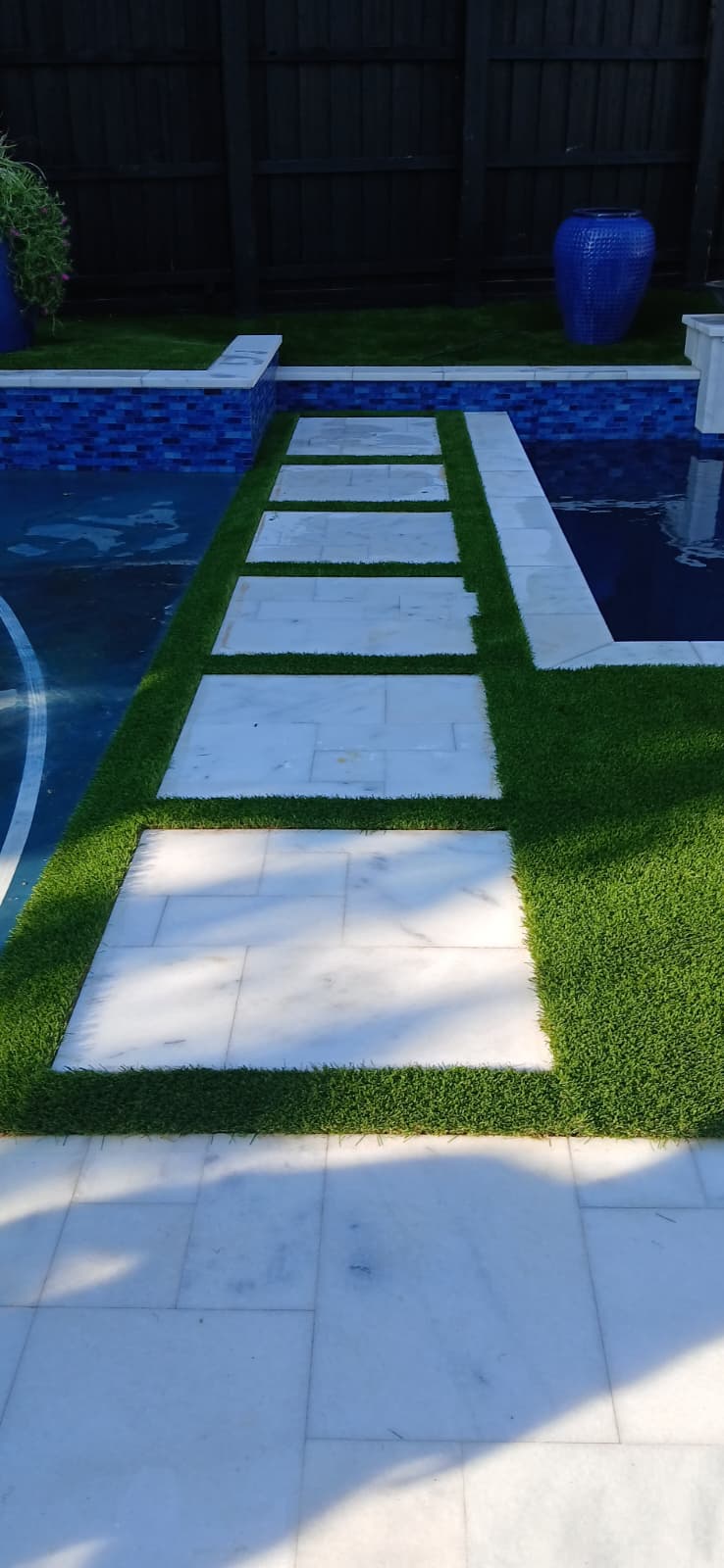 We installed premium turf and pavers to design a walkway and poolside area that perfectly complements the new pool. The addition of a custom putting green provided both aesthetic appeal and recreational value. The completed project features a seamless blend of turf and hardscaping that elevates the pool area’s look while offering a low-maintenance, elegant outdoor retreat.
