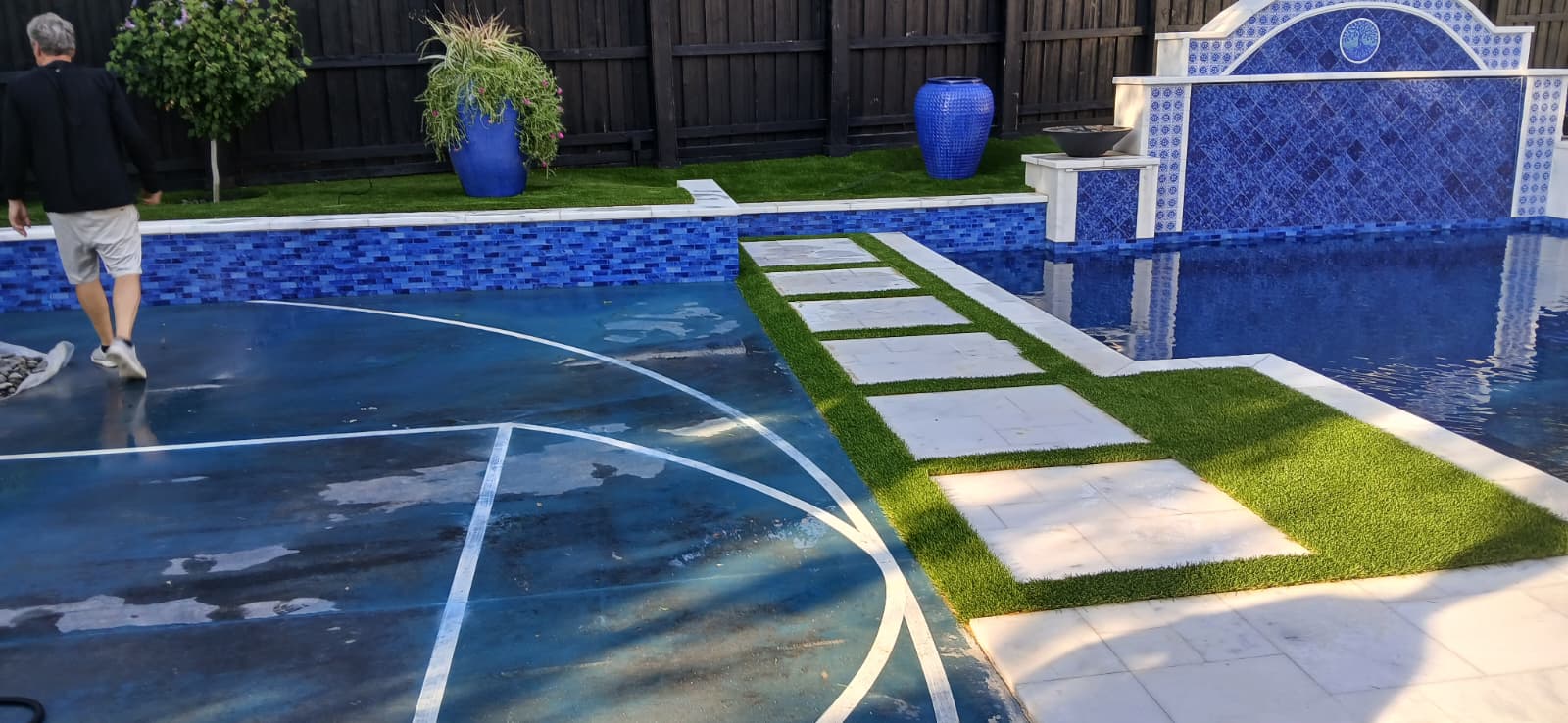 Multifunctional elegant outdoor retreat featuring artificial grass pool surround, a turf and paver walkway, and adjacent sports court. The premium synthetic turf creates a clean, low-maintenance pool decking area, seamlessly integrating recreation and relaxation in one synthetic turf installation.
