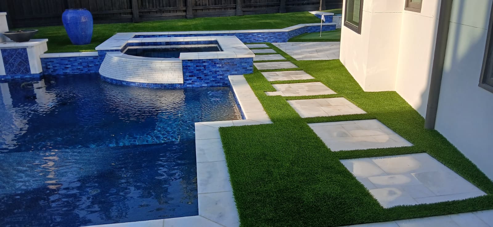 Modern synthetic turf installation alongside a new pool and spa, featuring a clean turf and paver walkway. The artificial grass pool surround provides low-maintenance pool decking, enhancing the elegant outdoor retreat with a safe, non-slip, and consistently green surface.