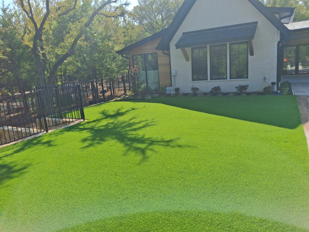 Vibrant, premium turf Austin TX installed in a residential front yard in Driftwood TX. This synthetic turf installation creates a low-maintenance side yard and front area with durable turf that stays green year-round, significantly enhancing the home's aesthetic appeal.