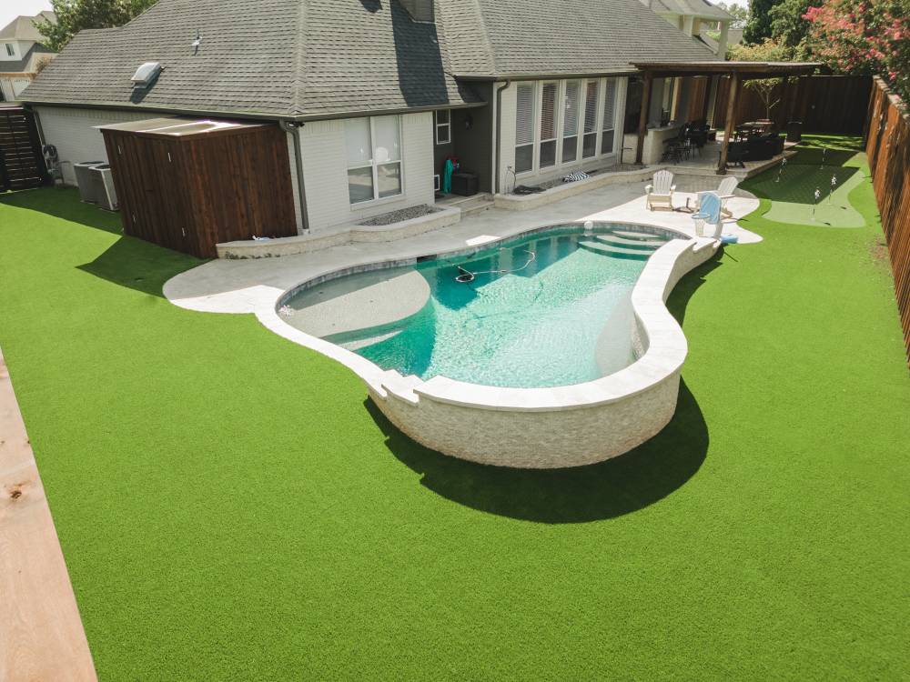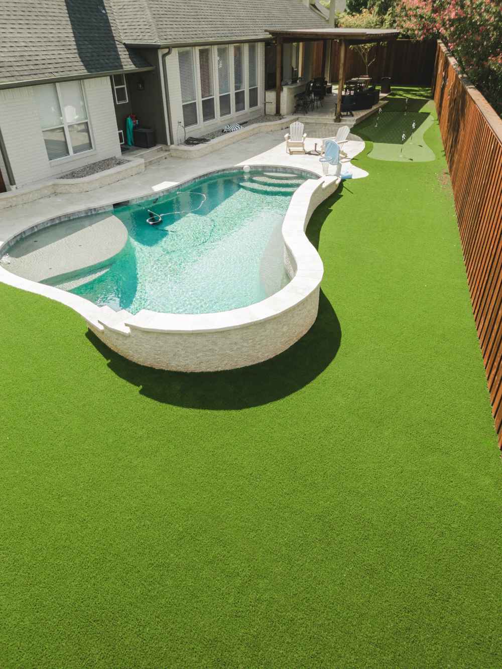 Toby's uniquely shaped backyard and pool area transformed with low-maintenance synthetic grass installation, offering a pristine, year-round lawn solution without the need for mowing. Ideal for homeowners seeking artificial turf for a beautiful, hassle-free outdoor space.