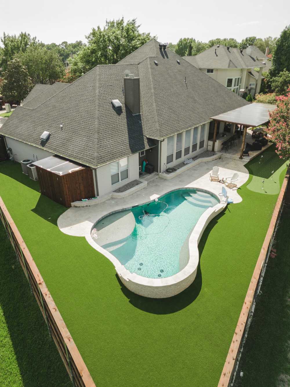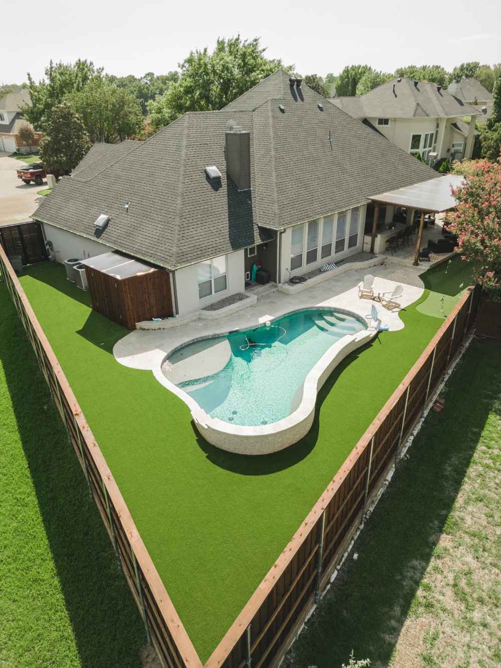 Complete artificial grass installation for a residential backyard featuring a unique pool shape, providing a low-maintenance, no-mow solution for difficult-to-reach areas. This synthetic turf project enhances the home's curb appeal with a consistently green, hassle-free lawn.
