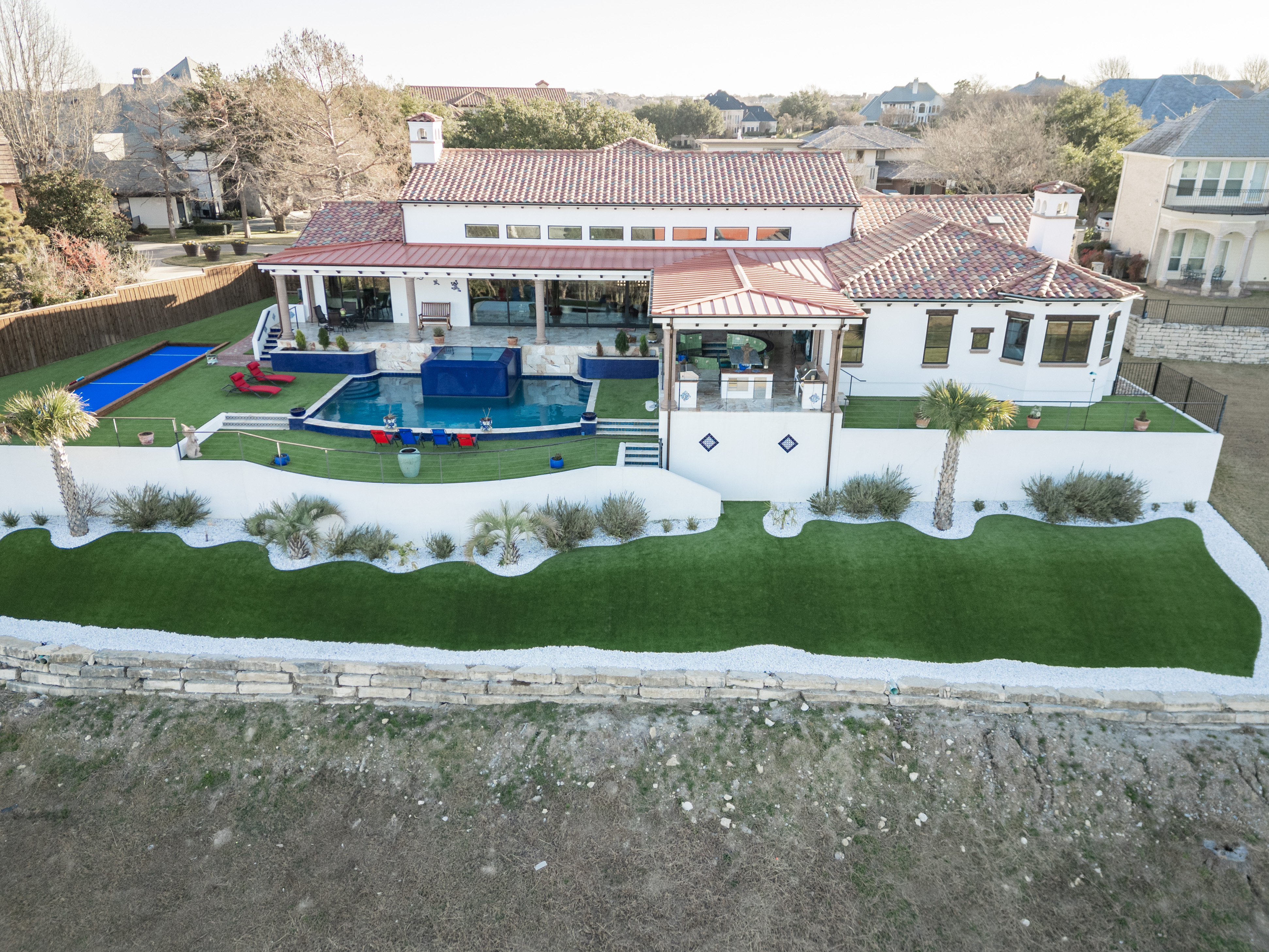 We installed a custom bocce ball court paired with surrounding turf, creating a polished, resort-style space that blends seamlessly with the home and encourages year-round outdoor enjoyment.