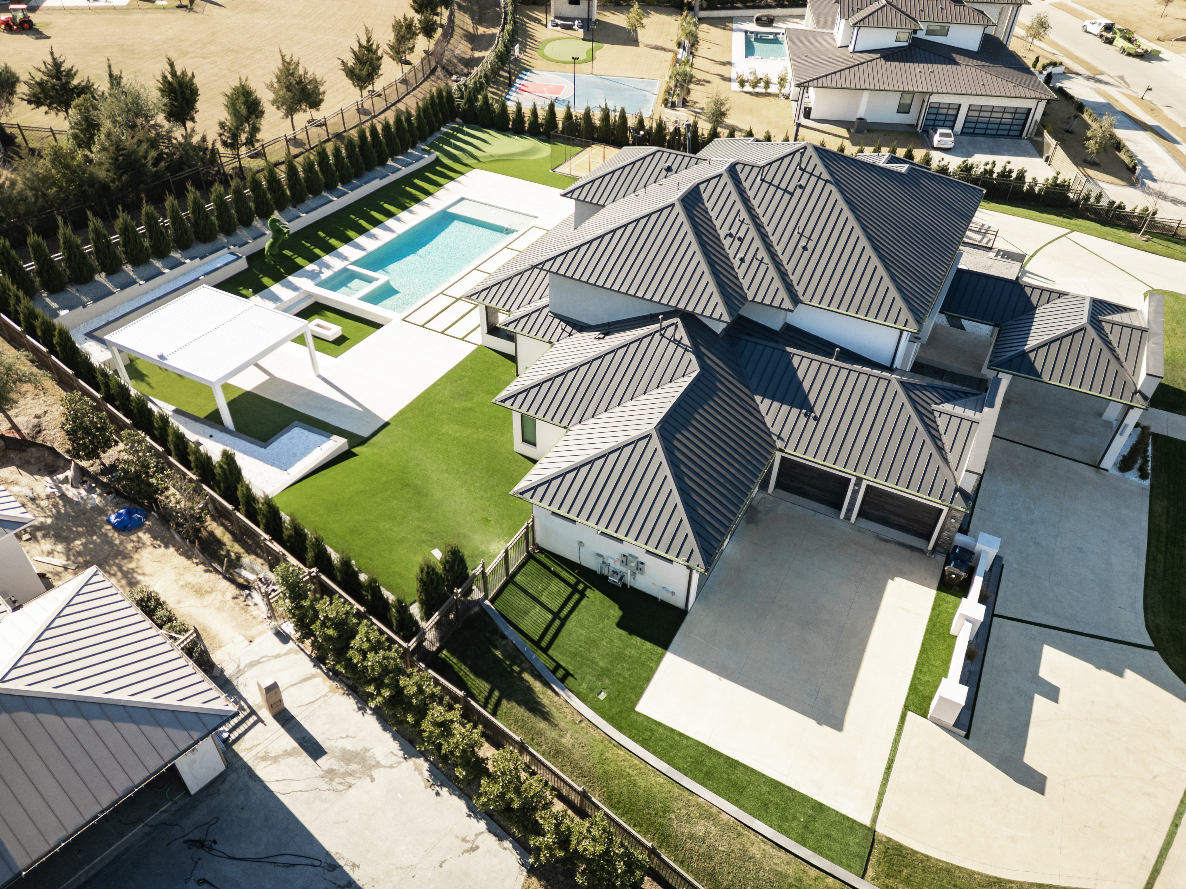 Aerial view of a luxurious modern home with a newly installed synthetic turf backyard, featuring a sparkling swimming pool, expansive concrete patios and walkways, and a dedicated sports court area with artificial grass, demonstrating a complete low-maintenance landscape transformation.