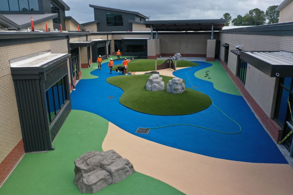 A durable, low-maintenance playground surface was installed, featuring blue safety surfacing, green artificial grass mounds, and tan pathways, enhancing the campus while standing up to daily use year-round.