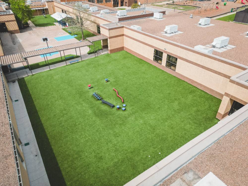 WinterGreen Grass installed a durable, low-maintenance artificial turf surface designed to enhance the campus environment, offering a clean, open space for play and recreation that can be used year-round.