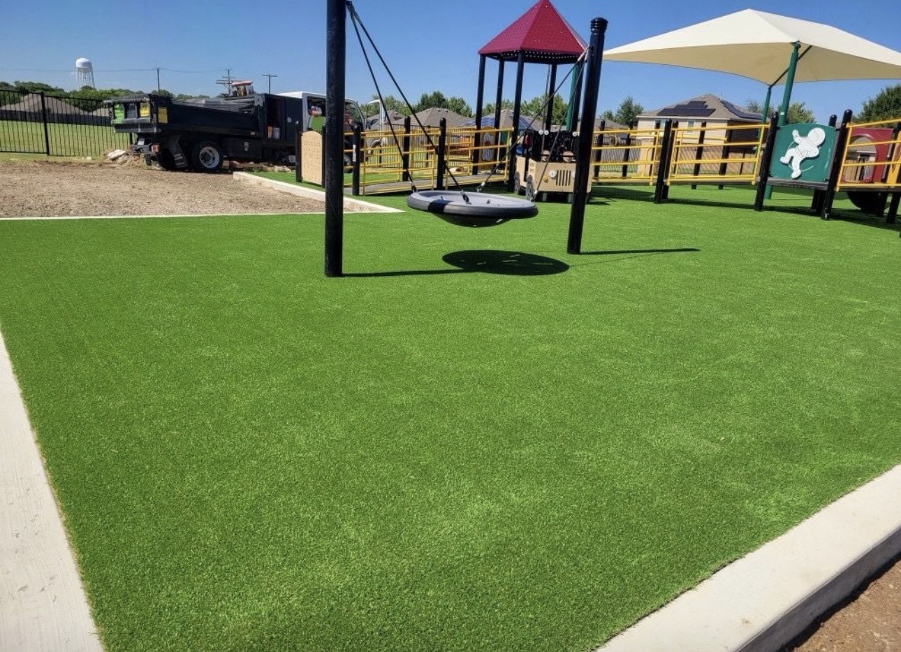This playground turf installation provides a soft, durable surface around the equipment while helping reduce mud, dust, and maintenance for the school.