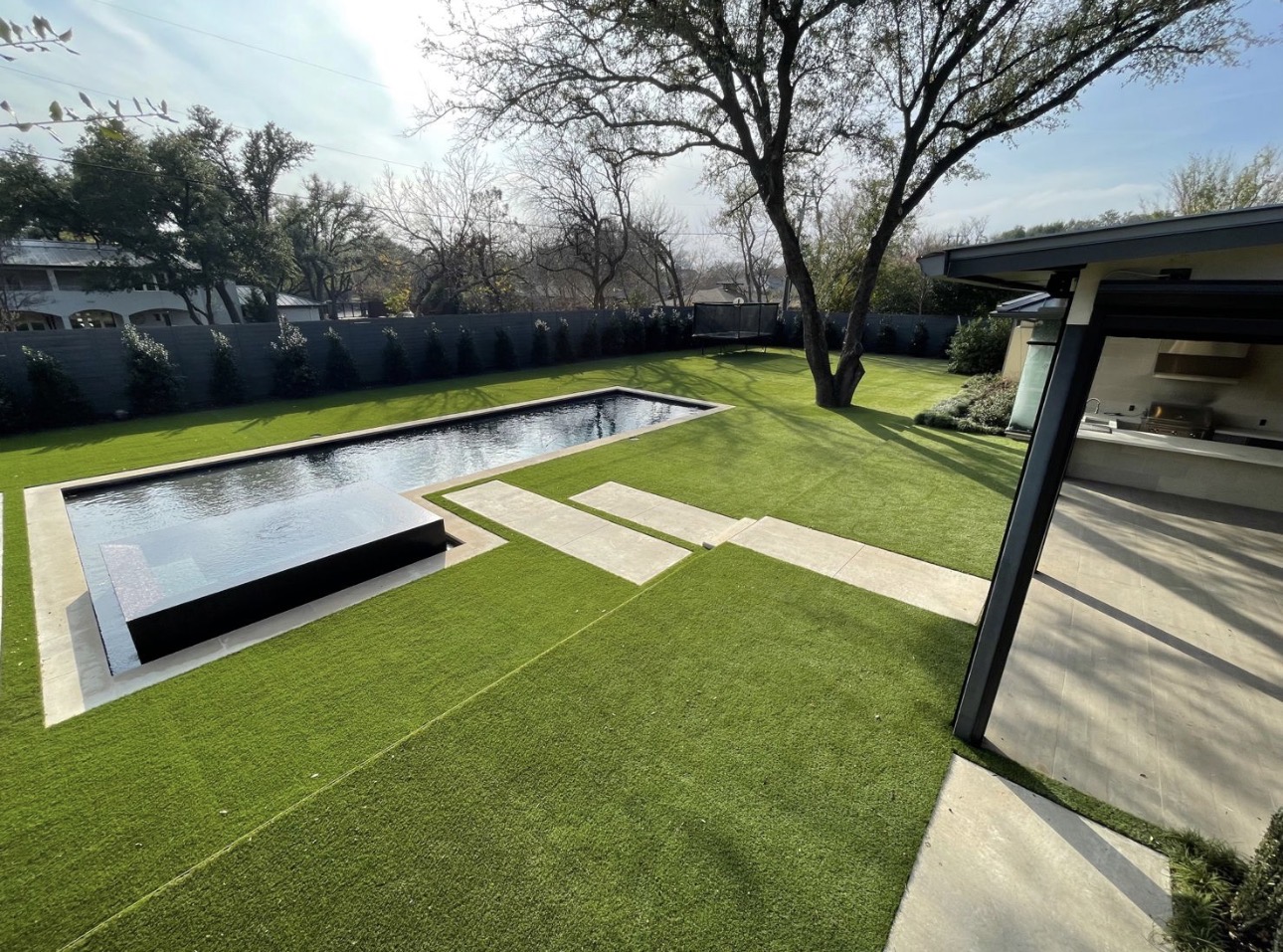 This installation included turf around the pool, a custom putting green, and beautifully finished lawn areas to create a low-maintenance backyard designed for relaxation, entertaining, and practice.