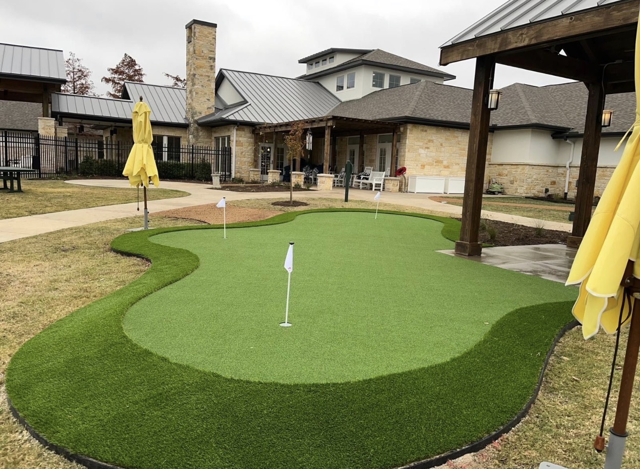 The customer, The Auberge at Plano, contacted us to create an outdoor recreational space where residents could relax, socialize, and engage in light physical activity while enhancing the overall look of the property.