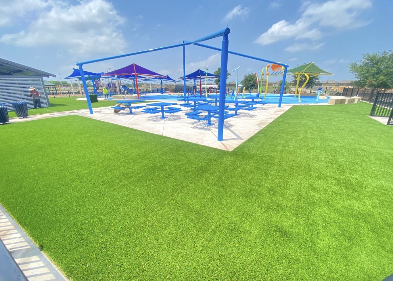 We installed high-quality artificial turf around the splash pad to provide a soft, durable surface. This solution helps reduce mud, minimize standing water, and lower maintenance needs, while improving safety and overall usability of the space.